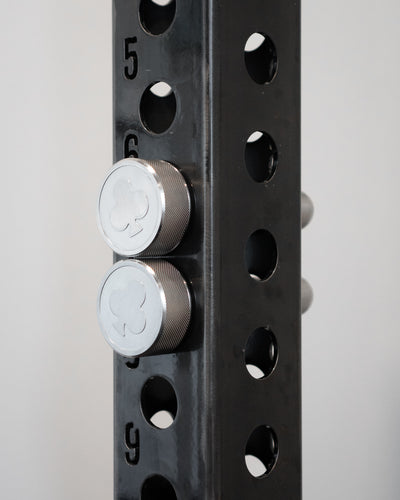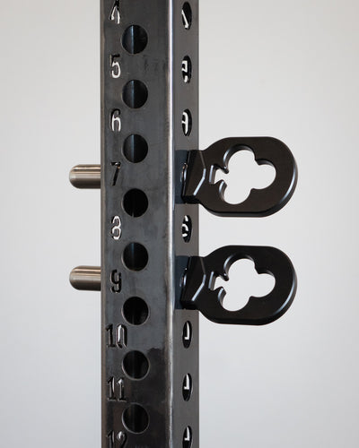 We love 'em, and you will too! Used throughout the gym to attach various accessories to racks and squats stands. What we don't love; hairpin clips, detent balls, and pin handles that look like they're from a tractor supply store.